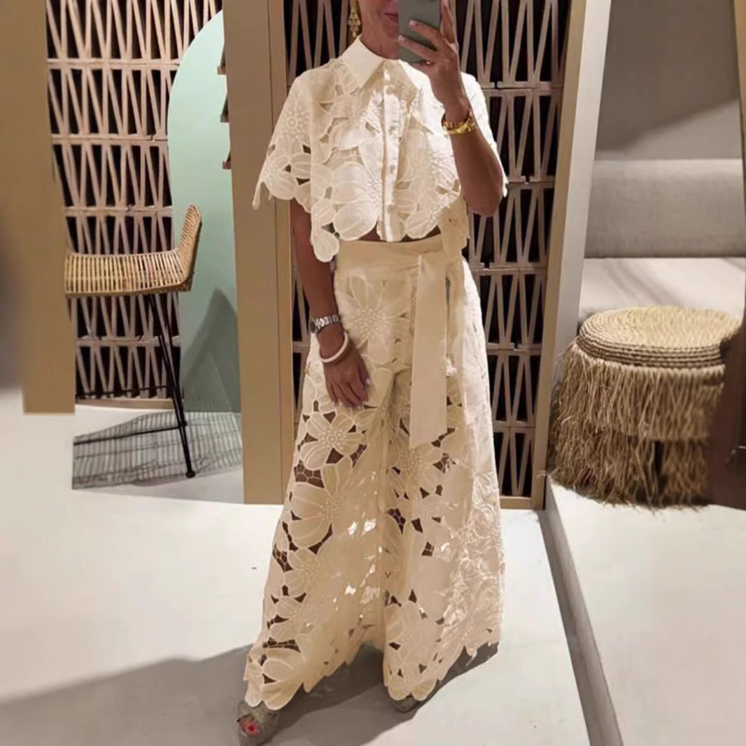 Women’s Lace Two-Piece Set – Floral Wide-Leg Pants & Crop Top